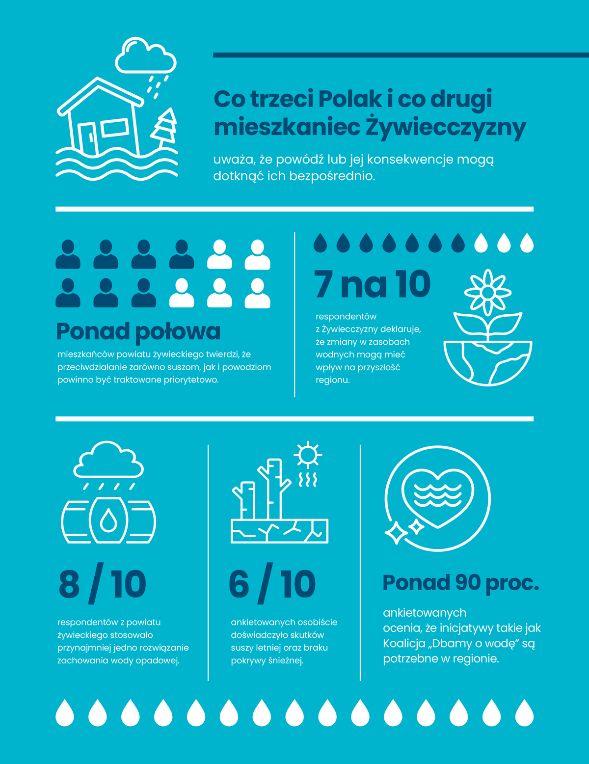 Już po raz drugi mieszkańcy regionu wskazali, że wśród priorytetów środowiskowych kwestie wodne są dla nich najważniejsze. Jako wyzwania, którym należy przeciwdziałać w pierwszej kolejności, mieszkańcy Żywiecczyzny najczęściej wskazują suszę i niedobory wody (54%) oraz powódź, powódź błyskawiczną i deszcze nawalne (52%). W przypadku grupy ogólnopolskiej te wskazania nie przekraczają 40%. Badania zostały zrealizowane przez firmę badawczą SW Research, a na ich podstawie opracowano raport „Zatrzymać deszcz tam, gdzie spadnie”.